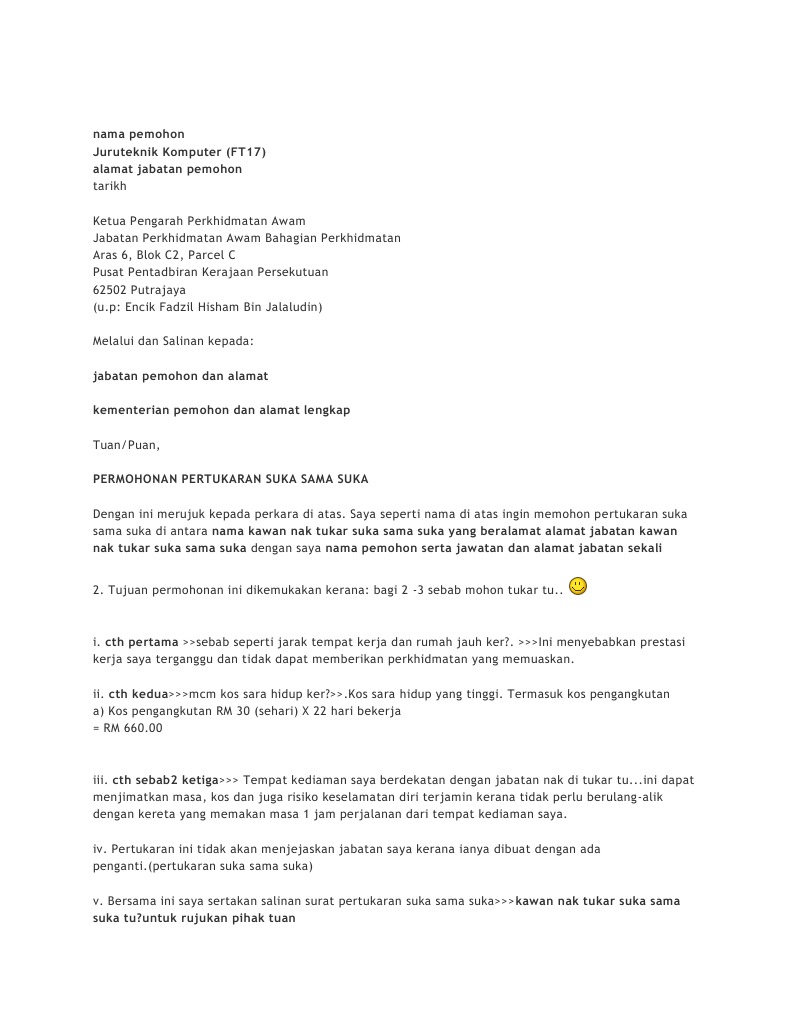 Pastikan anda menyatakan niat dan alasan kukuh untuk tukar tempat kerja. Nama di atas ingin memohon pertukaran sukasama suka di antara nama kawan nak tukar suka sama suka yang beralamat alamat jabatan kawan nak tukar suka sama suka dengan saya nama pemohon serta jawatan dan alamat jabatan pemohon. Hantarkan borang permohonan ini kepada.